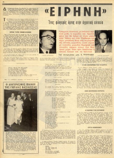 *Απόσπασμα από δισέλιδο άρθρο αφιερωμένο στην «Ειρήνη» του Αριστοφάνη (συντάκτης του, ο διακεκριμένος δημοσιογράφος Ευάγγελος Ψυρράκης, 1936-2006), που είχε δημοσιευτεί στον «Ταχυδρόμο» στις 13 Ιουνίου 1964, με αφορμή την παρουσίαση της περίφημης αριστοφανικής κωμωδίας από δύο θιάσους εκείνο το καλοκαίρι (από το Εθνικό Θέατρο, σε σκηνοθεσία Αλέξη Σολομού, και από το «Άρμα Θεάτρου», σε σκηνοθεσία Πέλου Κατσέλη).