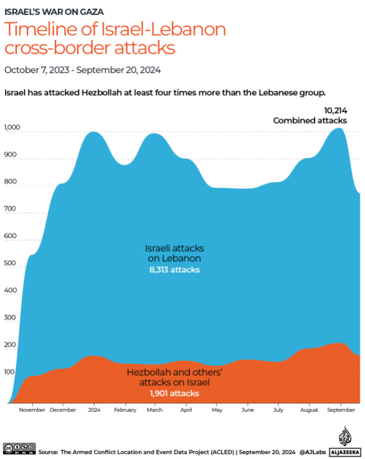 Το Ισραήλ έχει κάνει τέσσερις φορές περισσότερες επιθέσεις από τη Χεζμπολάχ από τις 7 Οκτωβρίου του 2023 μέχρι και τις 20 Σεπτεμβρίου του 2024.