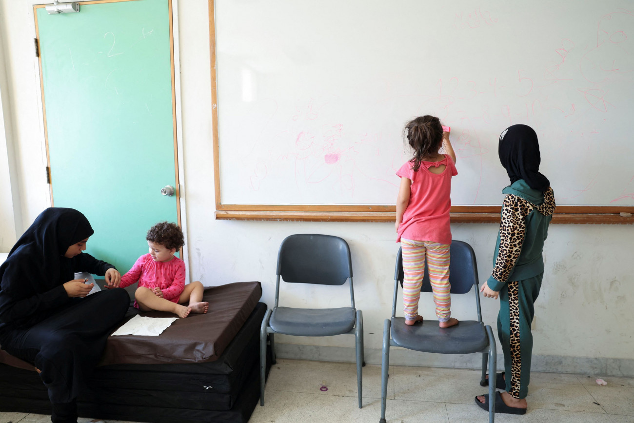 Παιδιά που έφυγαν από χωριά στο νότιο Λίβανο, παίζουν μέσα σε μια αίθουσα διδασκαλίας στο Τεχνικό Ινστιτούτο του Μπιρ Χασάν, το οποίο έχει μετατραπεί σε καταφύγιο
