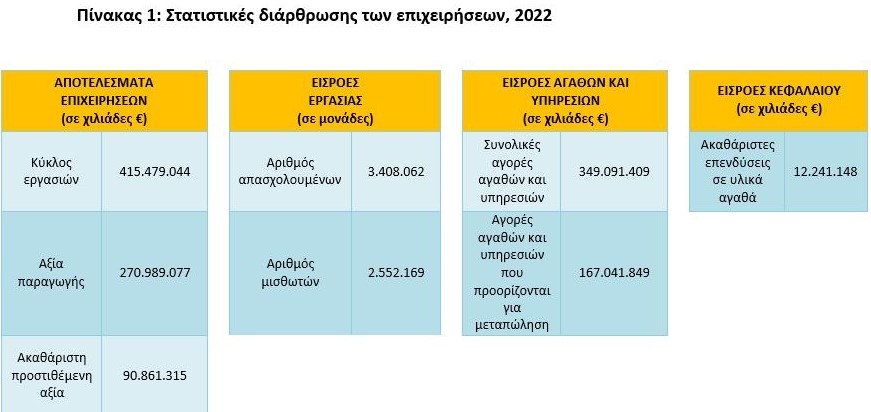Οι επιχειρήσεις πραγματοποίησαν επενδύσεις ύψους 12,2 δισεκατομμυρίων ευρώ κατά το 2022 (Πίνακας 1).
