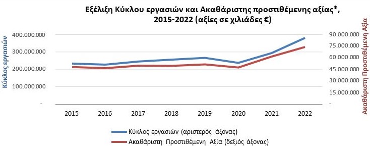 Ο συνολικός κύκλος εργασιών των επιχειρήσεων που δραστηριοποιούνται στην Ελλάδα στους τομείς της βιομηχανίας, των κατασκευών, του εμπορίου και των υπηρεσιών, για το έτος 2022, ανήλθε στα 415,5 δισεκατομμύρια ευρώ, ενώ η αξία παραγωγής και η ακαθάριστη προστιθέμενη αξία ανήλθαν στα 271,0 και 90,9 δισεκατομμύρια ευρώ, αντίστοιχα, σύμφωνα με τα στοιχεία που δημοσιοποίησε την Πέμπτη η ΕΛΣΤΑΤ.