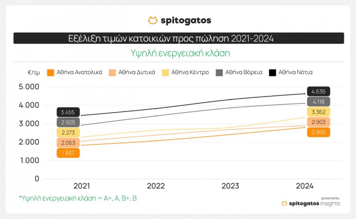 Από το 2021 μέχρι σήμερα, η μέση ζητούμενη τιμή των κατοικιών προς πώληση στην Αθήνα και τα Προάστια αυξήθηκε σημαντικά, με τις κατοικίες υψηλής ενεργειακής κλάσης να σημειώνουν τις μεγαλύτερες αυξήσεις σε όλες τις περιοχές.