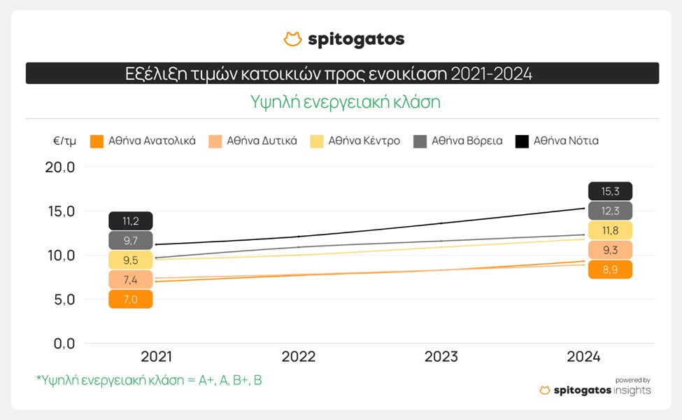 Στα Νότια Προάστια της Αθήνας εντοπίζεται η υψηλότερη μέση ζητούμενη τιμή ενοικίασης κατοικιών με υψηλή ενεργειακή κλάση δηλαδή A+, A, B+, B, φτάνοντας τα 15,3 ευρώ/τ.μ., ενώ η χαμηλότερη καταγράφεται στα Δυτικά Προάστια με 8,9 ευρώ/τ.μ. Εντυπωσιακή είναι η αύξηση 36,0% στη μέση ζητούμενη τιμή των ενοικίων για ενεργειακά αποδοτικές κατοικίες στα Νότια Προάστια από το 2021 έως το 2024. Σε σχέση με την προηγούμενη χρονιά, η μεγαλύτερη αύξηση στη μέση ζητούμενη τιμή ενοικίασης ενεργειακά αποδοτικών κατοικιών σημειώνεται στα Νότια Προάστια της Αθήνας (12,7%), ενώ ακολουθούν τα Ανατολικά Προάστια με αύξηση 12,3%.