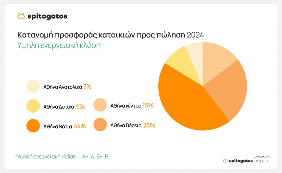 Στα Νότια Προάστια της Αθήνας συγκεντρώνεται πάνω από το 40% των διαθέσιμων προς πώληση κατοικιών υψηλής ενεργειακής κλάσης, ενώ ακολουθούν τα Βόρεια Προάστια και το κέντρο. Οι κατοικίες μεσαίας ενεργειακής κλάσης κατανέμονται πιο ομοιόμορφα σε Νότια, Βόρεια Προάστια και το κέντρο, με μικρότερες προσφορές στα Δυτικά και Ανατολικά Προάστια. Το 50% των κατοικιών χαμηλής ενεργειακής κλάσης βρίσκεται στο κέντρο της Αθήνας, ενώ ακολουθούν τα Νότια και Δυτικά Προάστια.