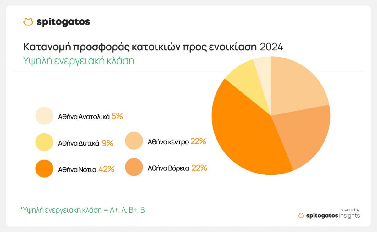 Για το 2024, τα Βόρεια και Νότια Προάστια της Αθήνας, μαζί με το κέντρο, συγκεντρώνουν πάνω από το 85% των διαθέσιμων κατοικιών προς ενοικίαση με υψηλή ενεργειακή κλάση (A+, A, B+, B), με τα Νότια Προάστια να κατέχουν άνω του 40%. Στις κατοικίες με μεσαία ενεργειακή κλάση, τα Νότια Προάστια διατηρούν την πρωτιά, ακολουθούμενα από το κέντρο της Αθήνας. Τέλος, το κέντρο της Αθήνας συγκεντρώνει πάνω από το 40% της προσφοράς κατοικιών χαμηλής ενεργειακής κλάσης (F και G).