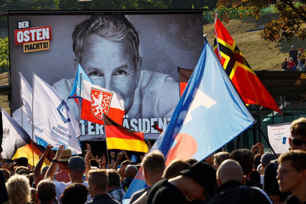 Σημαίες του ακροδεξιού AfD σε συγκέντρωση στη Θουριγγία, στην ανατολική Γερμανία, με φόντο αφίσα του εξτρεμιστή, κατηγορούμενου για νεοναζιστική ρητορική, Μπιόρν Χέκε (REUTERS/Wolfgang Rattay)