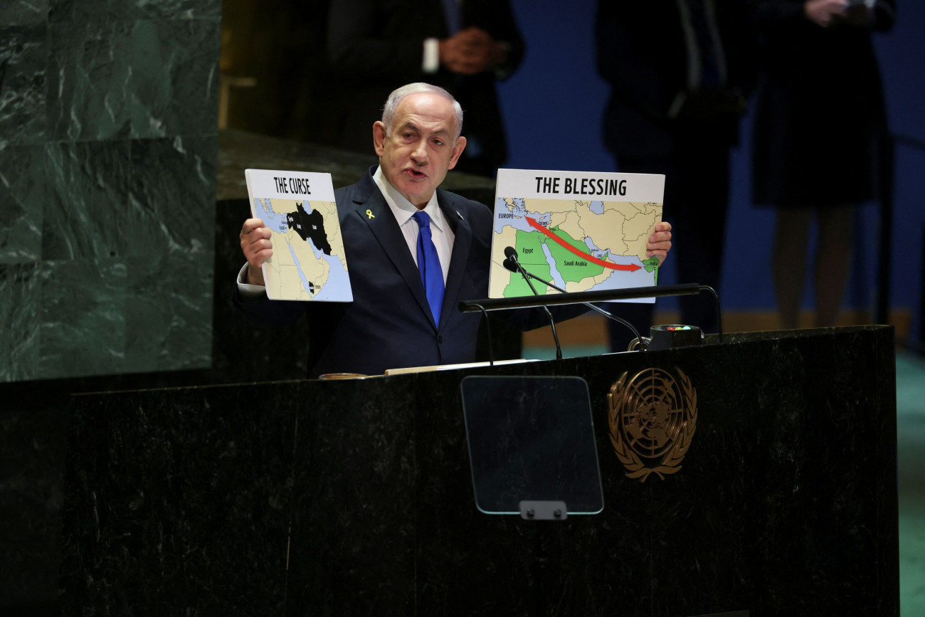 Παρουσίασε ακόμα δύο χάρτες όπου στον ένα το Ισραήλ εμφανιζόταν ως ενεργειακός κόμβος που συνδέει την Ασία με τη Δύση, κάτι που όπως είπε θα ωφελήσει δισεκατομμύρια ανθρώπους, και έναν δεύτερο με τις γειτονικές χώρες του Ισραήλ με μαύρο χρώμα – «άξονας του κακού» – που θα «κυριαρχήσουν» εάν χάσει το Ισραήλ.