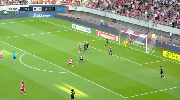 Η σέντρα έγινε από δεξιά, αλλά Βέλντε και Κωστούλας δεν μπόρεσαν να στείλουν την μπάλα στα δίχτυα του Χουτεσιώτη στο 21′.