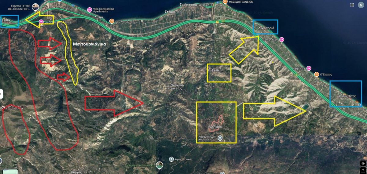 Όπως αναφέρεται «στο ύψος του Δερβενίου η εικόνα είναι αυτή. Τα βουνά σε ένα μήκος παράλληλα με την εθνική οδό περίπου 25 χιλιόμετρα, σχεδόν από την Ακράτα μέχρι το Ξυλόκαστρο, καίγονται ανεξέλεγκτα. Ομολογώ ότι δεν έχω ξαναδεί κάτι παρόμοιο. Οι καπνοί έχουν πνίξει μέχρι και την Κόρινθο. Είναι τεράστια η καταστροφή για την Κορινθία».