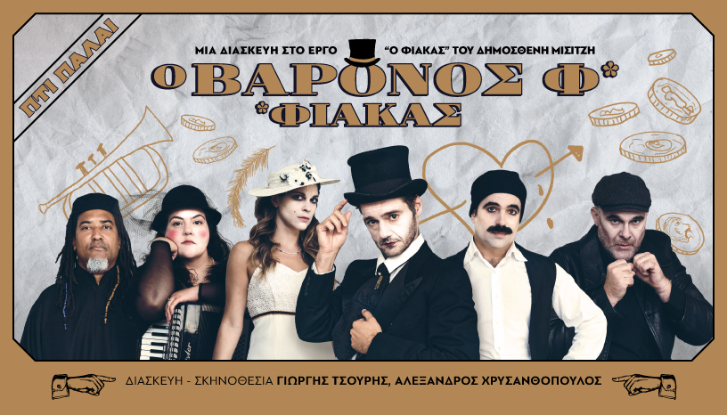 Ο Βαρόνος «Φ» (Φιάκας), κάνει πρεμιέρα στις 15 Δεκεμβρίου, με έναν εξαιρετικό θίασο, που ερμηνεύει ζωντανά τη μουσική και τα τραγούδια της παράστασης και αποτελείται από τους Θάνο Τοκάκη, Ηρώ Μπέζου, Θανάση Δόβρη, Ευαγγελία Καρακατσάνη και τον Γιωργή Τσουρή. Μαζί τους επί σκηνής, ο μουσικός Yoel Soto.