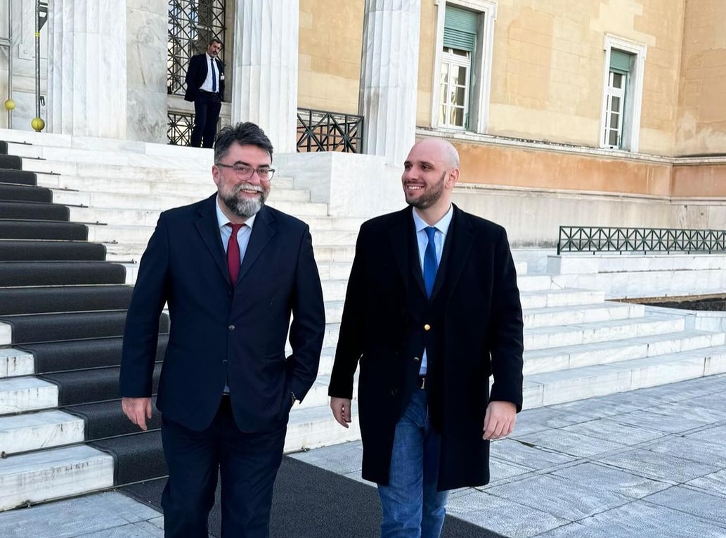 Ο Βασίλης Οικονόμου και ο Δημήτρης Καρράς έξω από τη Βουλή. «Ισχυρή φιλία» που δημιούργησε η πολιτική, έγραφε ο πρώην διευθυντής του πολιτικού γραφείου