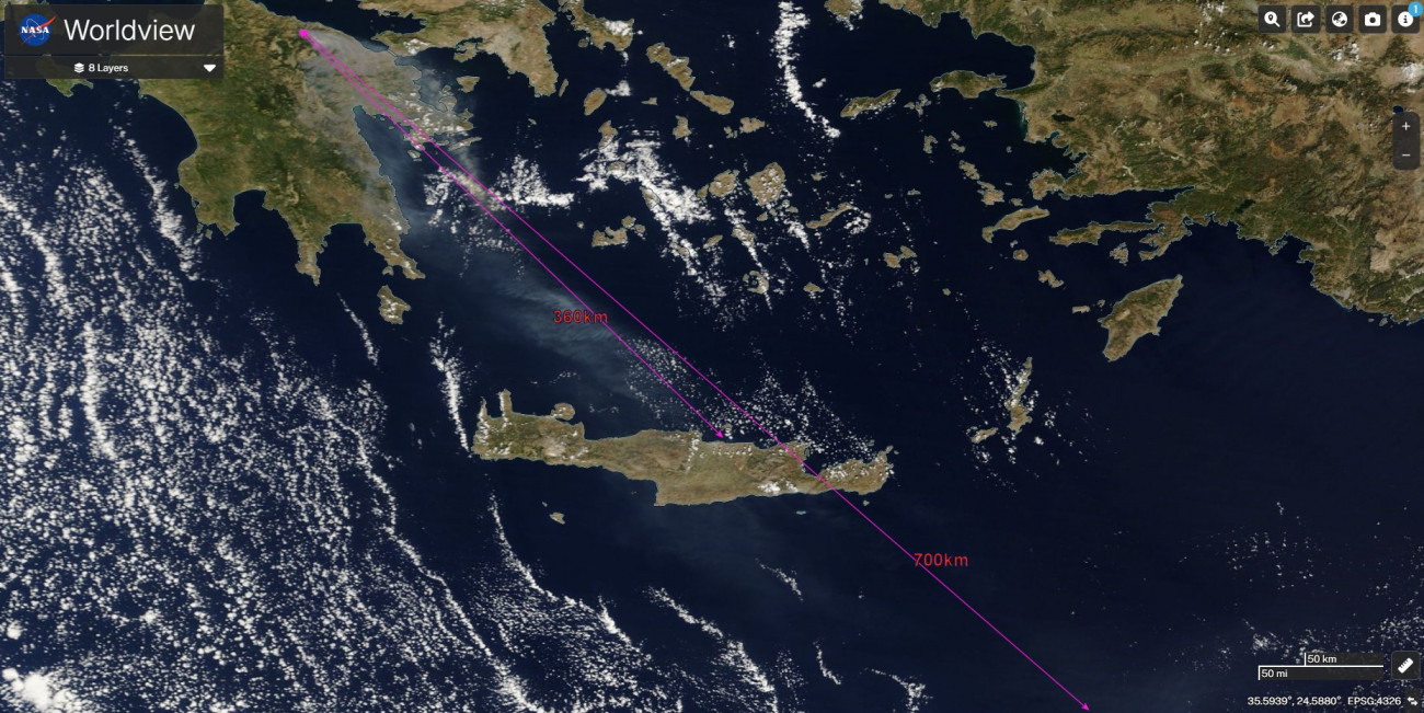 «Μεγάλη εξάπλωση παρουσιάζει ο καπνός από την φωτιά στην Κορινθία και διακρίνεται πολύ καθαρά μέχρι και την Κρήτη σε απόσταση 360 km. Λόγω της διατήρησης του ΒΔ ρεύματος αυτό το τριήμερο ο καπνός διαχέεται και σε μεγάλο μέρος και του Νοτιοανατολικού Κρητικού, περίπου 700km μακριά από την εστία της πυρκαγιάς».