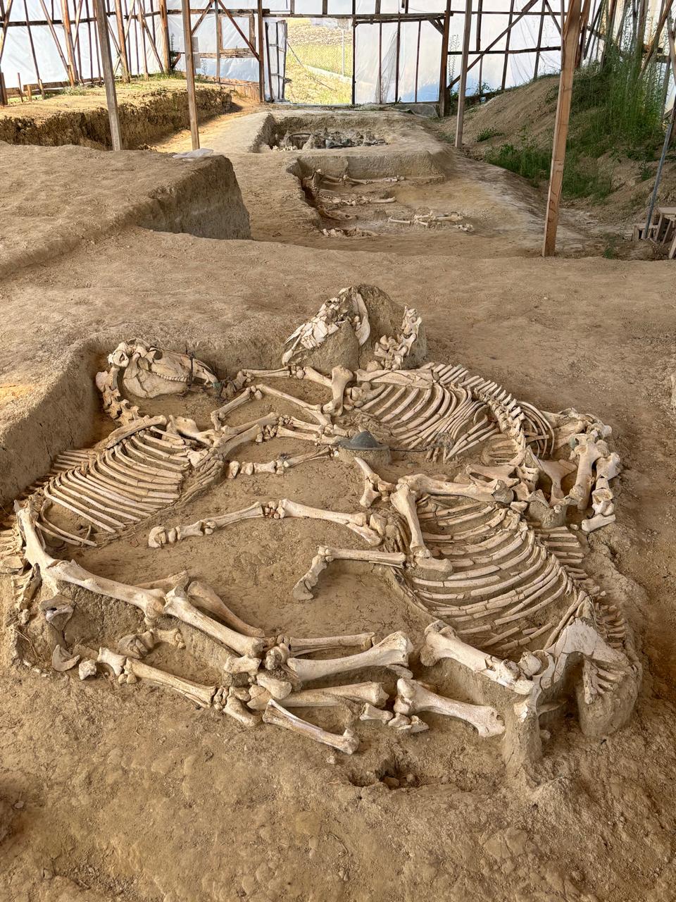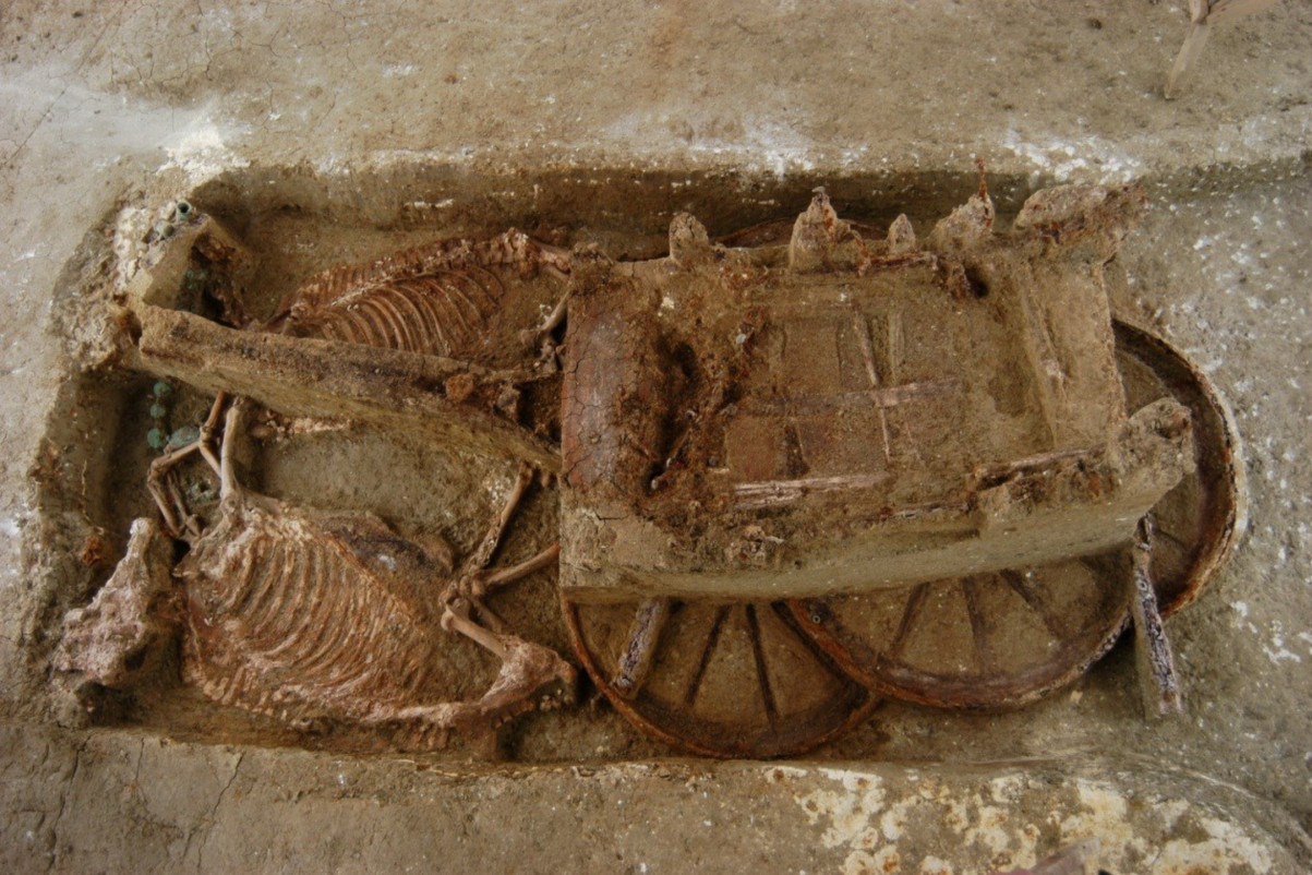 Στην ανασκαφή ερευνήθηκαν τέσσερις λάκκοι με υπολείμματα καύσεων τριών ανδρών και μιας γυναίκας που συνοδεύονταν από πολυάριθμα χάλκινα, σιδερένια, γυάλινα και πήλινα κτερίσματα, πέντε άμαξες με τα υποζύγιά τους καθώς και δύο ταφές πέντε επιπλέον αλόγων.