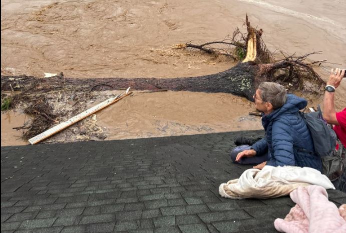 Οι συγκλονιστικές εικόνες δείχνουν το ζευγάρι αγκαλιασμένο μαζί, με τη μητέρα της να φοράει παλτό και να περιβάλλεται από κουβέρτες, καθώς τα νερά της πλημμύρας βρίσκονταν ελάχιστα μακριά από τη βάση της στέγης.