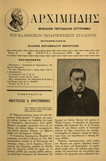 Νεκρολογία Αναστασίου Χρηστομάνου διά χειρός Δημητρίου Τσακαλώτου (1883-1919), διαπρεπούς φυσικοχημικού, που διετέλεσε τακτικός καθηγητής της Φυσικής Χημείας στο Εθνικό Πανεπιστήμιο και της Χημικής Τεχνολογίας στο Εθνικό Μετσόβιο Πολυτεχνείο. Είχε δημοσιευτεί στο μηνιαίο περιοδικό σύγγραμμα «Αρχιμήδης», έκδοση του Ελληνικού Πολυτεχνικού Συλλόγου (αριθ. 6, Οκτώβριος 1906).