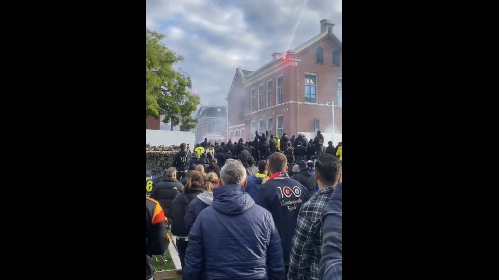 Een groep Fenerbache-fans in Enschede probeerden hun fanzone te verlaten. Al schreeuwend ‘fuck you Twente’, werd er o.a. vuurwerk gegooid. Onbekend richting wie of wat.