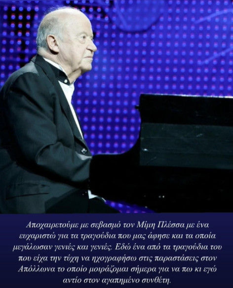 Πάνω στην φωτογραφία, έγραψε χαρακτηριστικά: «Αποχαιρετούμε με σεβασμό τον Μίμη Πλέσσα με ένα ευχαριστώ για τα τραγούδια που μας άφησε και τα οποία μεγάλωσαν γενιές και γενιές. Εδώ ένα από τα τραγούδια που είχα την τύχη να ηχογραφήσω στις παραστάσεις στον Απόλλωνα, το οποίο μοιράζομαι σήμερα για να πω κι εγώ αντίο στον αγαπημένο συνθέτη».