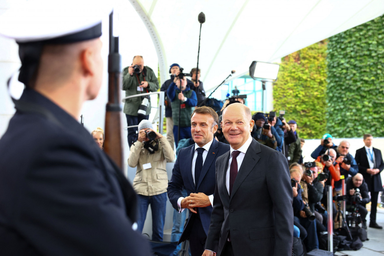 Στιγμιότυπο από την πρόσφατη συνάντηση του Εμανουέλ Μακρόν με τον Όλαφ Σολτς στο Βερολίνο.