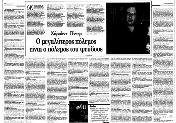 Στο φύλλο του «Βήματος» που είχε κυκλοφορήσει την Κυριακή 29 Ιανουαρίου 1995 είχε συμπεριληφθεί το κείμενο μιας ενδιαφέρουσας συνέντευξης που είχε παραχωρήσει ο Χάρολντ Πίντερ στον Θανάση Λάλα.