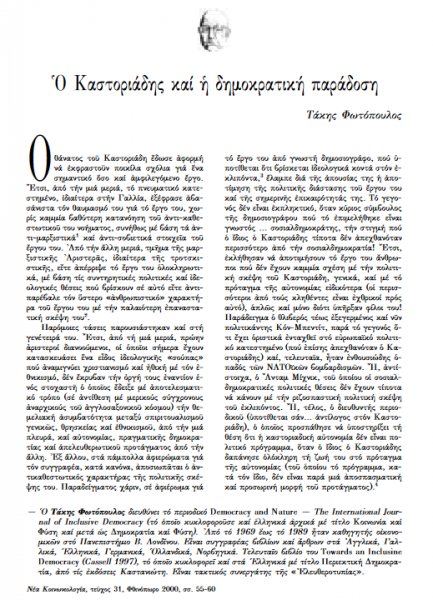 *Αποσπάσματα από κείμενο του Τάκη Φωτόπουλου, που έφερε τον τίτλο «Ο Καστοριάδης και η δημοκρατική παράδοση» και είχε δημοσιευτεί στο περιοδικό Νέα Κοινωνιολογία το φθινόπωρο του 2000 (τεύχος 31).