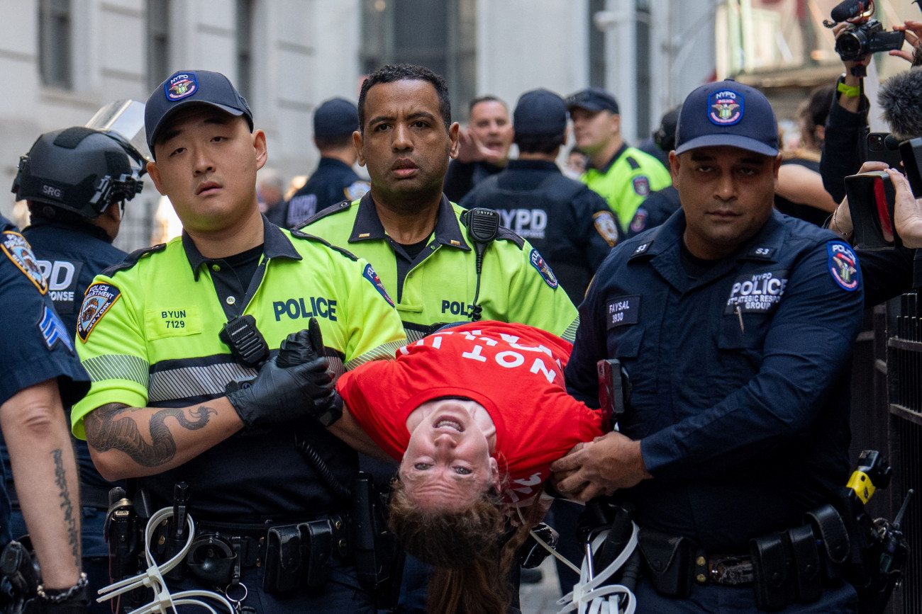 Κανένας από τους διαδηλωτές υπέρ της Παλαιστίνης δεν μπήκε μέσα στο χρηματιστήριο, αλλά τουλάχιστον 200 κατάφεραν να μπουν μέσα σε έναν φράχτη ασφαλείας στην Broad Street, όπου κάθισαν και περίμεναν να τους συλλάβουν.