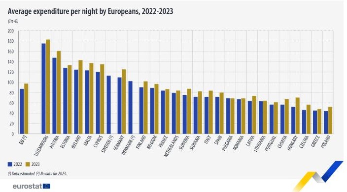 Οι κάτοικοι της ΕΕ ξόδεψαν κατά μέσο όρο 97,6 € ανά διανυκτέρευση.
