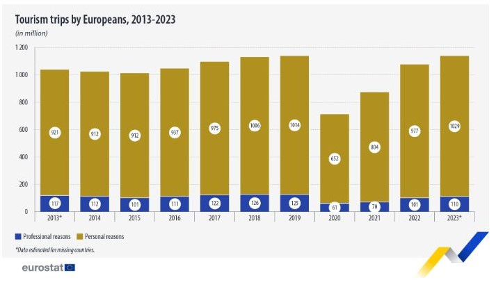 Περισσότερα ταξίδια για τουρισμό πραγματοποίησαν οι Ευρωπαίοι το 2023, σε σύγκριση με το 2022. Συγκεκριμένα, όπως προκύπτει από την ανάλυση των στοιχείων που εκπόνησε η Eurostat, οι κάτοικοι της ΕΕ πραγματοποίησαν 1,14 δισεκατομμύρια τουριστικά ταξίδια με τουλάχιστον μία διανυκτέρευση ήτοι 5,7% (+61,6 εκατομμύρια) περισσότερα σε ετήσια βάση.