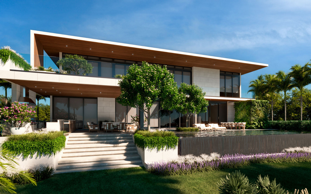 Οι κήποι με φοίνικες πλαισώνουν τους χώρους και η μεγάλη πισίνα υπερχείλισης που βρίσκεται δίπλα σε μια μαρμάρινη βεράντα φωτίζεται από υπαίθριο χώρο ψυχαγωγίας με αυτόνομη κουζίνα.