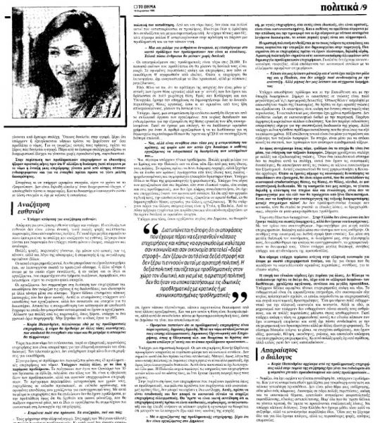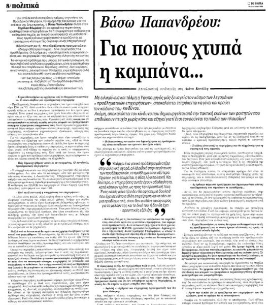 *Απόσπασμα από συνέντευξη που είχε παραχωρήσει η Βάσω Παπανδρέου στη δημοσιογράφο Λιάνα Κανέλλη και στην εφημερίδα «Το Βήμα» το καλοκαίρι του 1986. Ο τίτλος της συνέντευξης, που είχε δημοσιευτεί στο φύλλο της 10ης Αυγούστου 1986, ήταν ο εξής: «Βάσω Παπανδρέου: Για ποιους χτυπά η καμπάνα…»