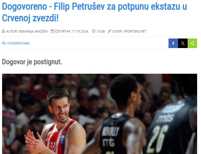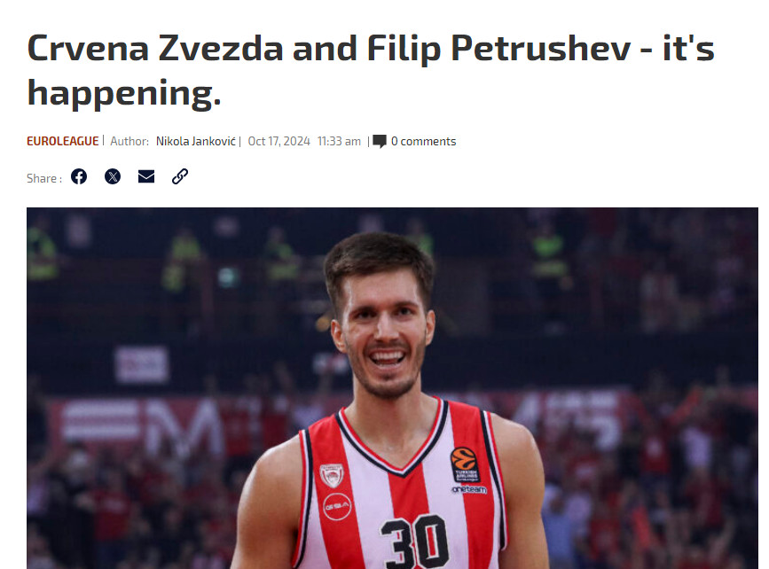 «Σύμφωνα με τις πληροφορίες του «Sportske.net», ο Πετρούσεφ θα γίνει παίκτης του Ερυθρού Αστέρα και θα μοιράζεται τα λεπτά με τον Mike Daum στη θέση «4». Αν και ο Αμερικανός έπαιξε εξαιρετικά στα τελευταία παιχνίδια, είναι ξεκάθαρο ότι η ομάδα χρειάζεται βάθος σε αυτή τη θέση. Ήταν γνωστό πριν από ένα μήνα, όταν ο πρωταθλητής της ABA League ήταν κοντά στο να φέρει τον Σέρβο διεθνή, αλλά οι τραυματισμοί των Μουσταφά Φαλ και Νίκολα Μιλουτίνοφ δεν επέτρεψαν την ολοκλήρωση του deal», αναφέρει χαρακτηριστικά το σερβικό δημοσίευμα.