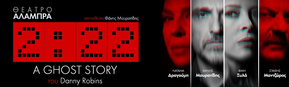 Στη σκηνή του Θεάτρου ΑΛΑΜΠΡΑ, για πρώτη φορά στην Ελλάδα, παρουσιάζεται τη νέα θεατρική σεζόν 2024-2025, σε σκηνοθεσία του Φάνη Μουρατίδη, το έργο “2:22 – A Ghost Story” του Danny Robbins, ένα σύγχρονο υπερφυσικό θρίλερ που έχει αποσπάσει διθυραμβικές κριτικές στο West End του Λονδίνου, υποψηφιότητες για 3 βραβεία Laurence Olivier, καθώς και το βραβείο «Καλύτερου Νέου Έργου» στα Βραβεία WhatsOnStage, το 2022.