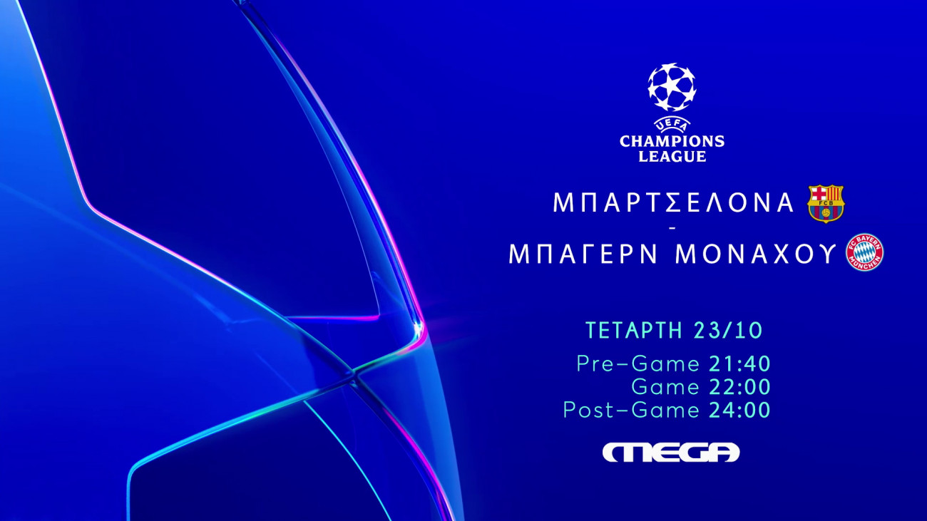 Το UEFA Champions League συνεχίζεται με το μεγάλο ντέρμπι της 3ης αγωνιστικής. Την Τετάρτη 23 Οκτωβρίου, στις 22:00, το MEGA φέρνει ζωντανά στις οθόνες μας την αναμέτρηση γιγάντων Μπαρτσελόνα – Μπάγερν Μονάχου.