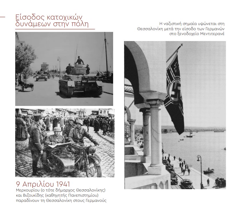 Δείχνει μέσα στο λεύκωμα φωτογραφίες των κατοχικών δυνάμεων με φόντο το Λευκό Πύργο, καθώς και τη ναζιστική σημαία υψωμένη πάνω από την παραλιακή λεωφόρο στο ξενοδοχείο Μεντιτερανέ.