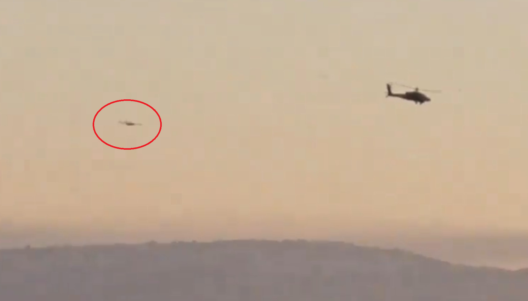 Στις εικόνες φαίνεται ένα επιθετικό ελικόπτερο Απάτσι να πετά δίπλα στο drone καμικάζι.