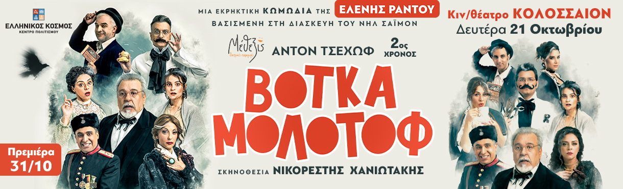 Η φλογερή κωμωδία της Ελένης Ράντου, «Βότκα Μολότοφ», βασισμένη στη διασκευή του Νηλ Σάιμον πάνω στα διηγήματα του Τσέχωφ παρουσιάζεται στην αίθουσα Ιφιγένεια του Κέντρου Πολιτισμού «Ελληνικός Κόσμος».