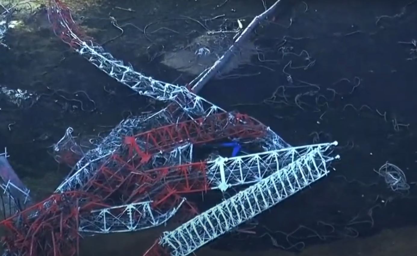 Σε άλλες εικόνες διακρίνεται ένα κουβάρι από κόκκινες και λευκές μεταλλικές δοκούς στο έδαφος που φαίνεται να προέρχεται από τον κατεστραμμένο πύργο τηλεπικοινωνιών.