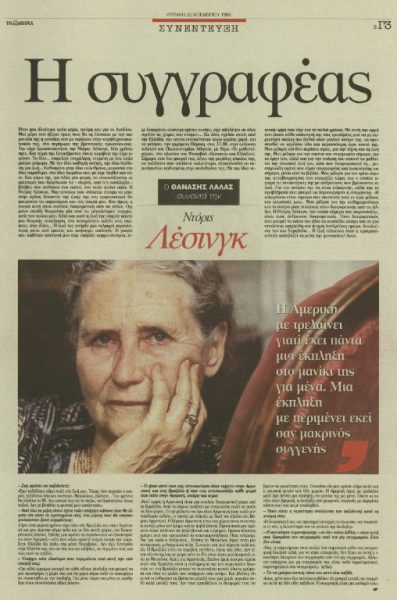 Στο φύλλο του «Βήματος» που είχε κυκλοφορήσει την Κυριακή 22 Νοεμβρίου 1998 υπήρχε το κείμενο μιας εκτενέστατης συνέντευξης που είχε παραχωρήσει η Ντόρις Λέσινγκ στον Θανάση Λάλα.