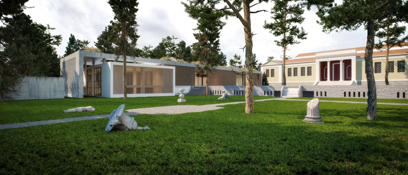 Το κάτω αδιαμόρφωτο επίπεδο προορίζεται για υπαίθρια γλυπτοθήκη και χώρο πρασίνου. Για την τοποθέτηση του νέου κτηρίου στη συγκεκριμένη θέση κατεδαφίζονται όλα τα διάσπαρτα μικροκτίσματα, τα οποία κατασκευάσθηκαν σε διαφορετικές χρονικές στιγμές για να καλύπτουν κυρίως ανάγκες αποθήκευσης και φύλαξης ευρημάτων. Απομακρύνονται, επίσης, όλα τα κοντέινερ, τα οποία αλλοιώνουν την εικόνα του περιβάλλοντος χώρου του Μουσείου και εμποδίζουν την ανεμπόδιστη θέασή του.