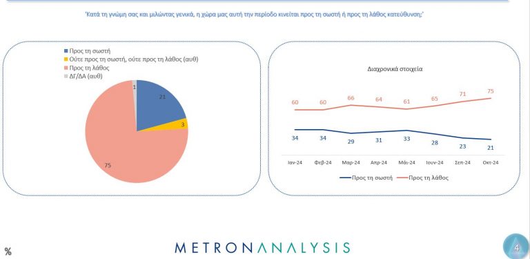 Στο ερώτημα αν η χώρα μας αυτή την περίοδο κινείται προς τη σωστή ή προς τη λάθος κατεύθυνση το 75% απαντά προς τη λάθος αυξανόμενο συνεχώς από τον Ιανουάριο του 2024.