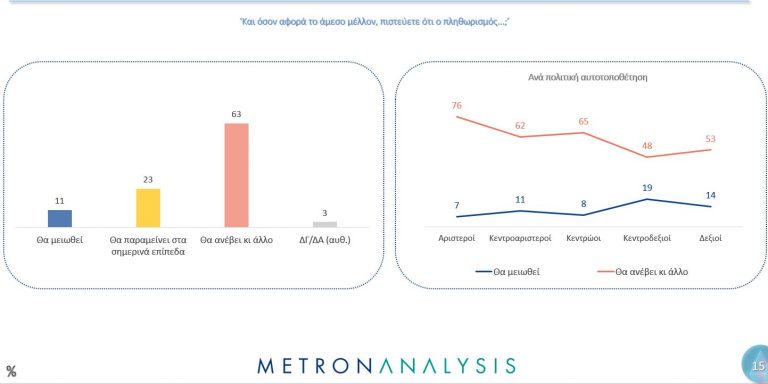 Τελικά, οι προσδοκίες για το μέλλον παραμένουν χαμηλές και η απαισιοδοξία επικρατεί, καθώς σχεδόν 2 στους 3 εκτιμούν ότι η αύξηση του πληθωρισμού δεν θα σταματήσει εδώ.