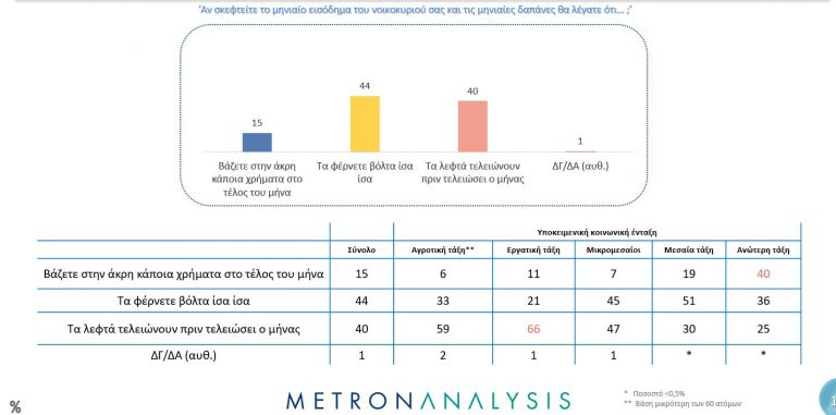 Οι περισσότεροι δηλώνουν ότι είτε οριακά τα βγάζουν πέρα είτε ότι τα χρήματα τελειώνουν προτού τελειώσει ο μήνας. Σχεδόν 9 στους 10 δηλώνουν πως «τα φέρνουν βόλτα ίσα ίσα» και «τα λεφτά τελειώνουν πριν «τελειώσει ο μήνας».