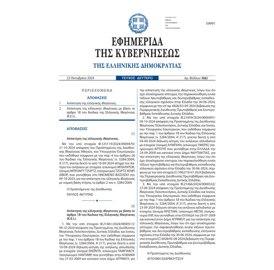 «Με την υπό στοιχεία Φ.125119/2024/0009470/ 21-10-2024 απάφαση του Προϊσταμένου της Διεύθυνσης Ιθαγένειας Αθηνών, του Υπουργείου Εσωτερικών, που εκδόθηκε σύμφωνα με την παρ. 4 του άρθρου 26 του Κώδικα της Ελληνικής Ιθαγένειας (ν. 3284/2004, Α’ 217), γίνεται δεκτό το από 16-09-2024 αίτημα του πατέρα του ανήλικου με στοιχεία: (επώνυμο) ΜΠΑΛΝΤΟΚ, (όνομα) ΜΠΡΟΝΤΥ ΤΖΟΡΤΖ, (πατρώνυμο) ΤΖΟΡΤΖ ΧΕΝΡΙ ΑΙΒΟΡ, που γεννήθηκε στο ΗΝΩΜΕΝΟ ΒΑΣΙΛΕΙΟ την 09-10-2023, για την απόκτηση της ελληνικής ιθαγένειας με νομική βάση κτήσης το άρθρο 2 του ν. 3284/2004».