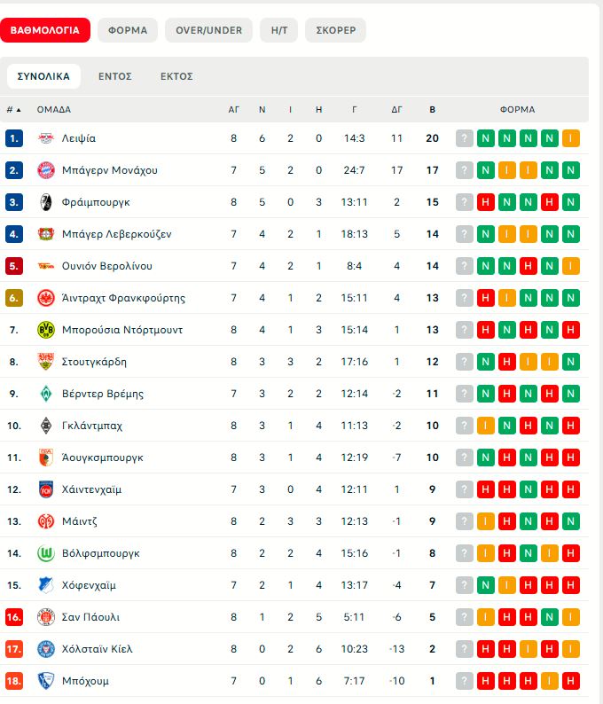 Μόνη πρώτη στη βαθμολογία της Bundesliga βρίσκεται η Λειψία που για την 8η αγωνιστική νίκησε με 3-1 την Φράιμπουργκ και άφησε την Μπάγερν, που έχει ματς λιγότερο, στο -3. Οι φιλοξενούμενοι προηγήθηκαν στο ημίχρονο, αλλά στο δεύτερο οι «ταύροι» πέτυχαν τρία γκολ και πήραν το τρίποντο.