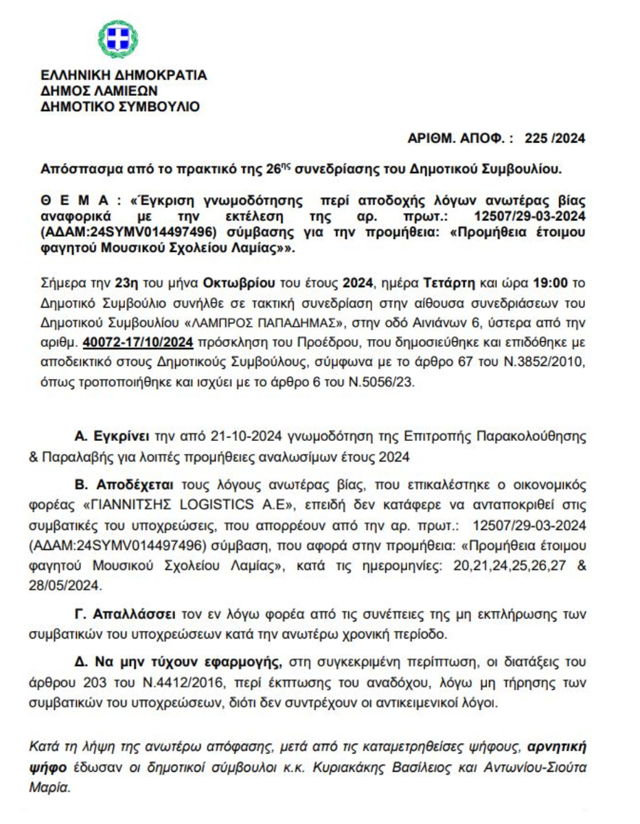 Η απόφαση του δημοτικού συμβουλίου του δήμου Λαμιέων για την συνέχιση της σύμβασης για τα σχολικά γεύματα του μουσικού σχολείου της πόλης.