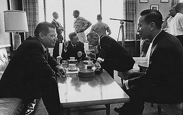 Ο υπουργός Άμυνας Ρόμπερτ ΜακΝαμάρα συναντά τον Πρωθυπουργό του Νοτίου Βιετνάμ Nguyen Cao Ky, τον Πρόεδρο Λύντον Τζόνστνο και τον υποστράτηγο Nguyen Van Thieu (Νότιο Βιετνάμ) κατά τη διάρκεια της Διάσκεψης της Χονολουλού, στο Camp Smith της Χαβάης στις 8 Φεβρουαρίου 1966 (AFP PHOTO/NATIONAL ARCHIVES).