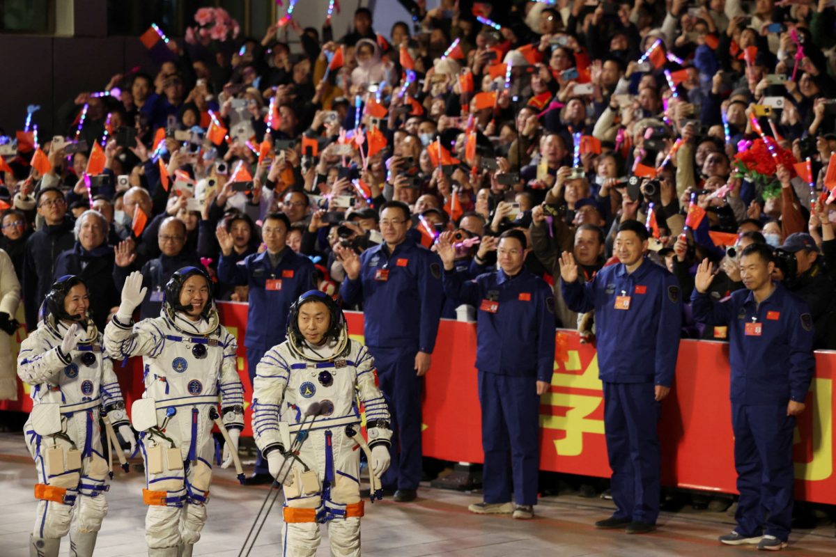 Οι τρεις «ταϊκοναύτες» του Shenzhou-19 χαιρετούν το πλήθος πριν από την εκτόξευση (Reuters)