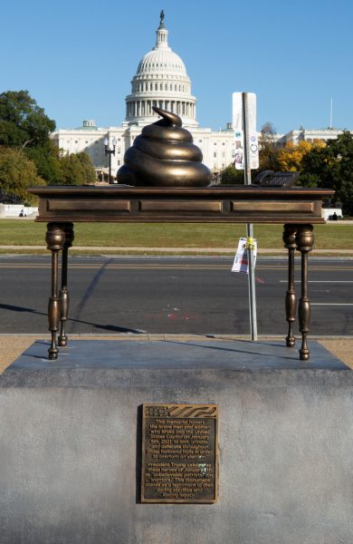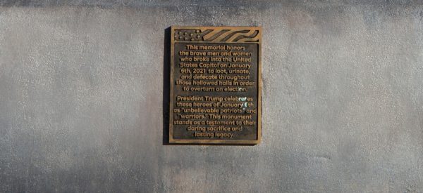 «Αυτό το μνημείο τιμά τους γενναίους άνδρες και γυναίκες που εισέβαλαν στο Καπιτώλιο των Ηνωμένων Πολιτειών στις 6 Ιανουαρίου 2021 για να λεηλατήσουν, να ουρήσουν και να αφοδεύσουν σε όλους αυτούς τους καθαγιασμένους χώρους προκειμένου να ανατρέψουν μια εκλογή», γράφει η πλάκα περιγραφής του έργου.