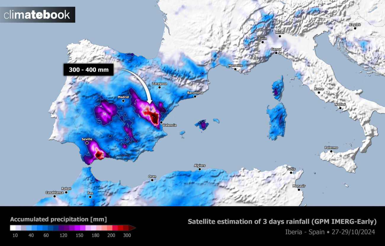 Τα προκαταρκτικά δορυφορικά δεδομένα που κατέγραψε η επιστημονική ομάδα του Climatebook δείχνουν ότι μια μεγάλη περιοχή της Ανατολικής Ισπανίας δέχθηκε πάνω από 100-150 χιλιοστά βροχής (180 χιλιοστά στο κέντρο της Βαλένθια), και τοπικά πάνω από 250 χιλιοστά σε λιγότερο από 24 ώρες.