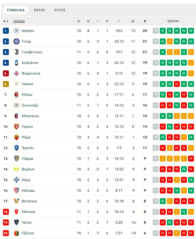 Τα αποτελέσματα και το πρόγραμμα της 11ης αγωνιστικής της Serie A: