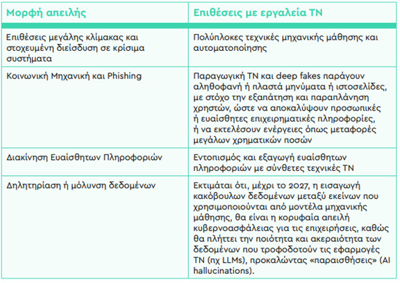 Στον πίνακα που ακολουθεί αποτυπώνονται οι μορφές απειλής και οι επιθέσεις με εργαλεία ΤΝ.